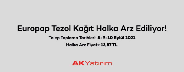 Europap Tezol Kağıttan yapılan açıklamaya göre Deniz Yatırım aracılığıyla halka arz için Sermaye Piyasası Kuruluna SPK başvuran şirket Türkiyenin 500 Büyük Sanayi Kuruluşu 2020 Araştırmasında 439. Hızlı geçen halka arz takviminde Eylül ayının ilk haftası SPKnın onay verdiği Europap Tezol Kağıt halka arz edecek. Halka arz 1387 TL sabit fiyattan gerçekleşecek olup 20000000 TL nominal değerli paylar ortak satışı yoluyla halka arz edilecektir.